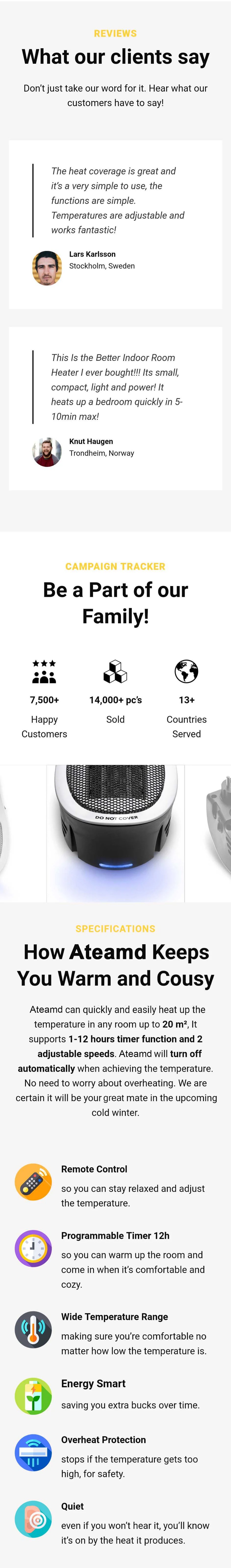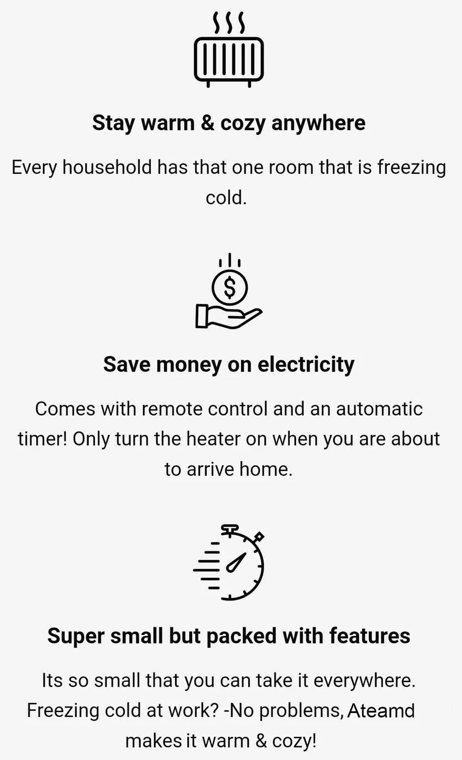 Ateamd quickly heats up any room using 30% less energy than regular heaters(no more stepping on ice-cold bathroom tiles!).The only mini heater that makes you warm and cozy-while saving your money!